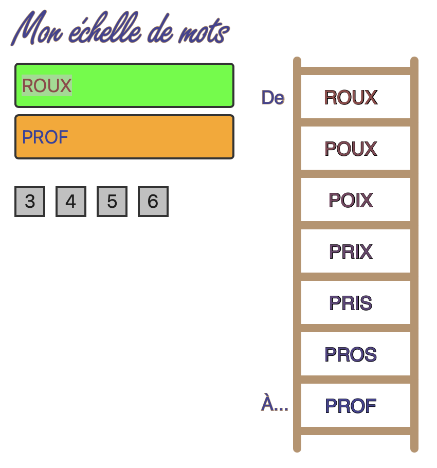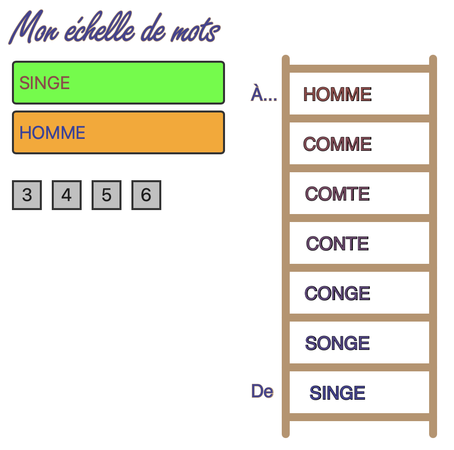 Instructions: saisissez deux mots de même taille (de 3, 4, 5 ou 6 caractères) dans les cases éditables en haut à gauche. La liste des mots pour passer de l'un à l'autre est donnée dans l'échelle à droite. Attention les mots de 5 ou 6 lettres exigent de longs temps d'exécution.